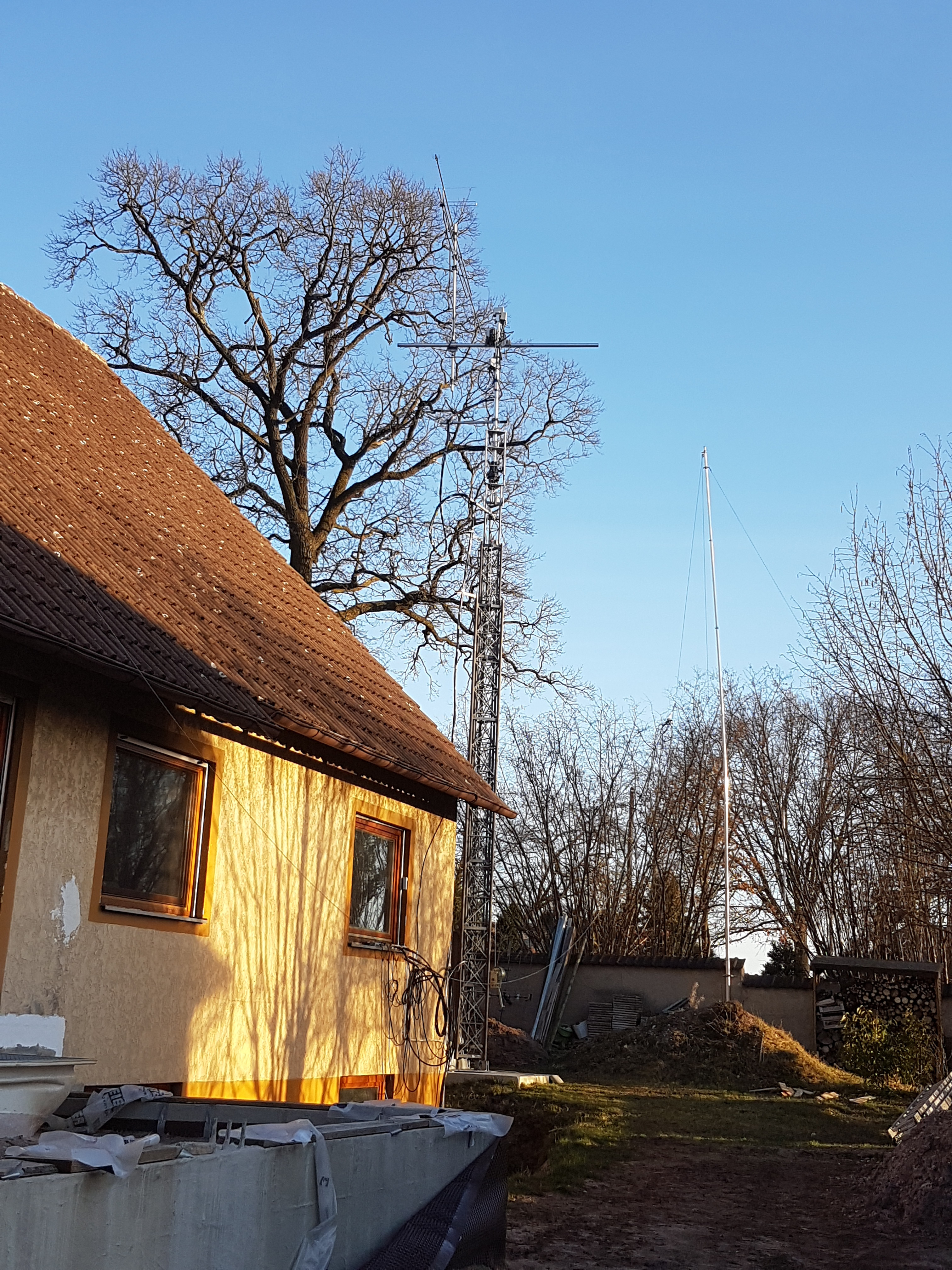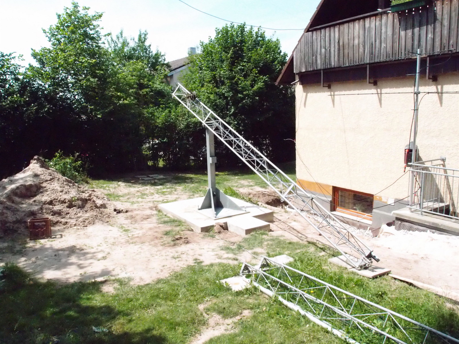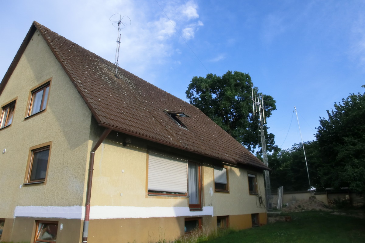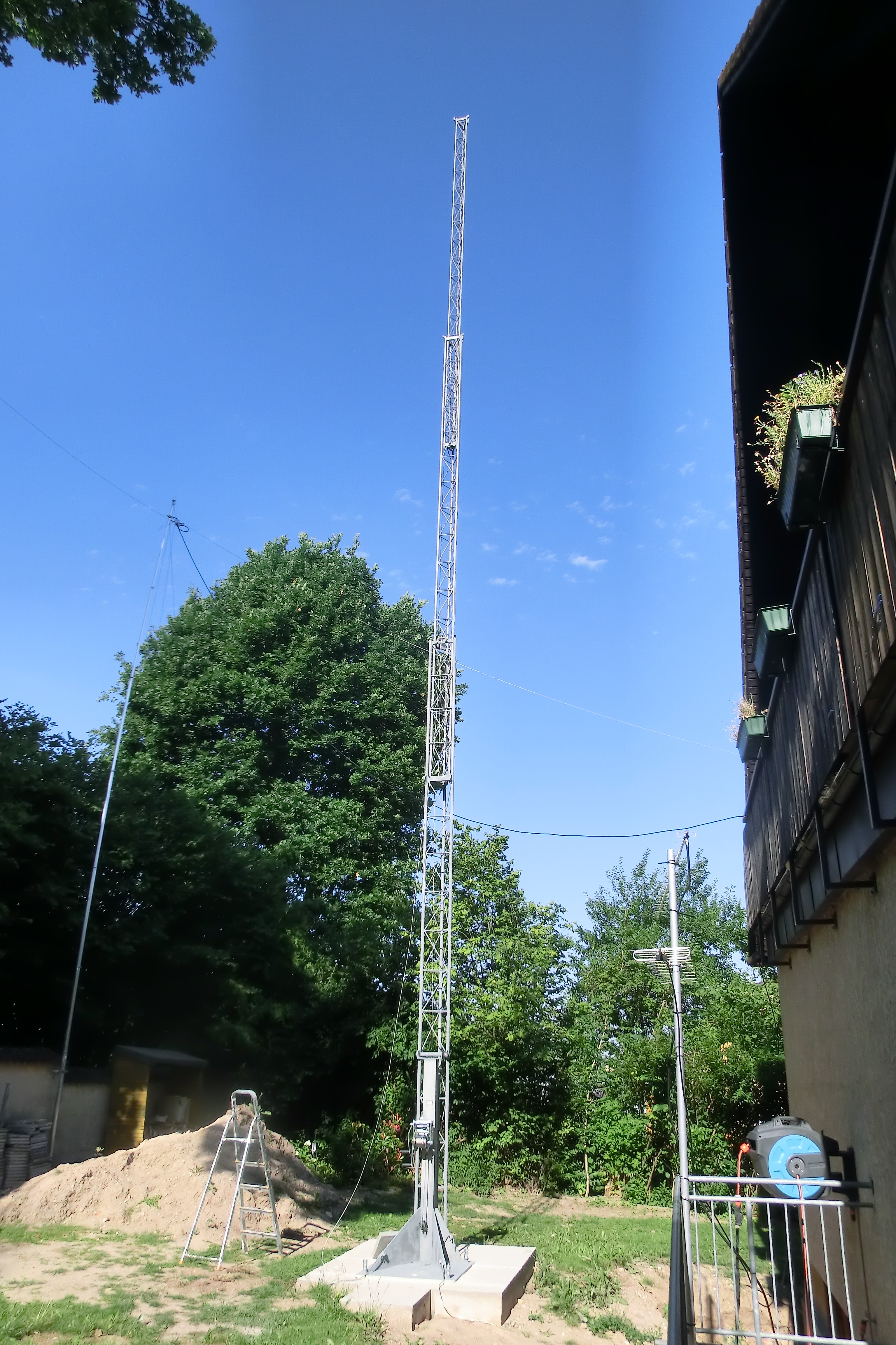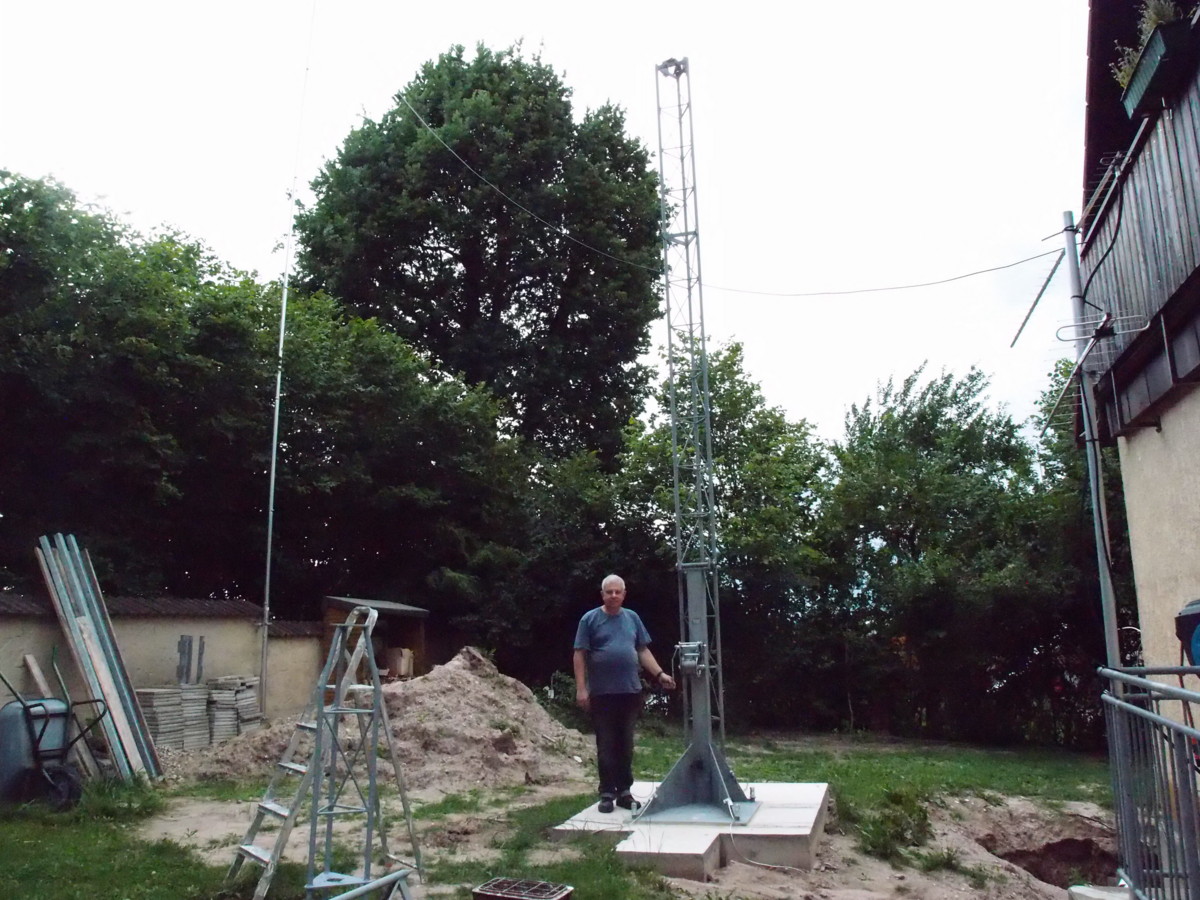 I got my first licence in 1984 but because of my qrl I had to move a couple of times. Every time I had to find a house with place for antennas and a landlord, willing to admit to drill holes in his house and to build up antennes. And each time I found some of the neighbours with electronic equipment which did not fulfil the electromagnetic standards. So my dream was all the years for the time after retirement to have my own house and a Versatower. I love this typ of construction because it allows me not only to lower the mast when we have heavy wind, but also to tilt it over to work at the antennas more or less from the ground ( I dislike to be high over the ground).