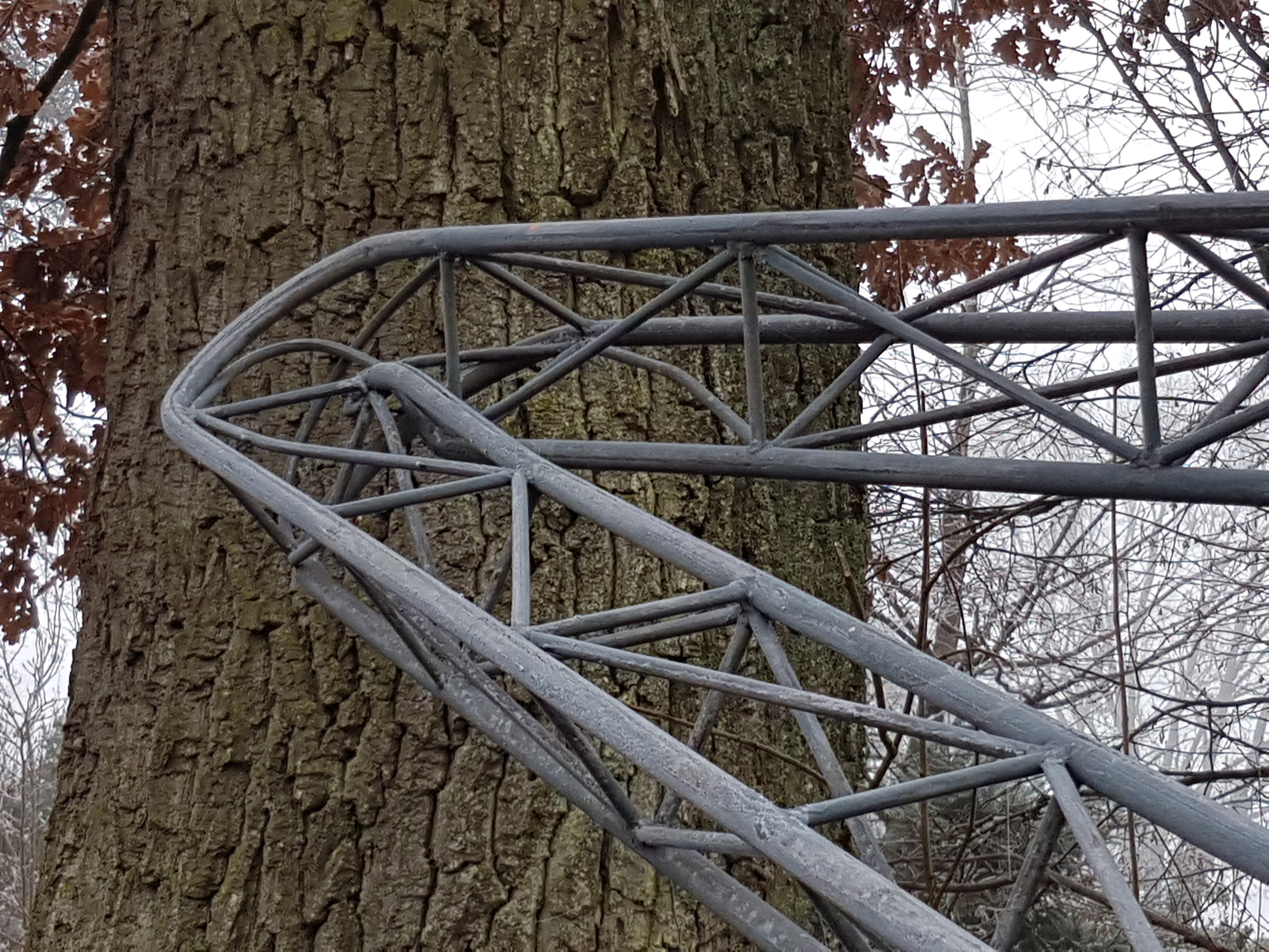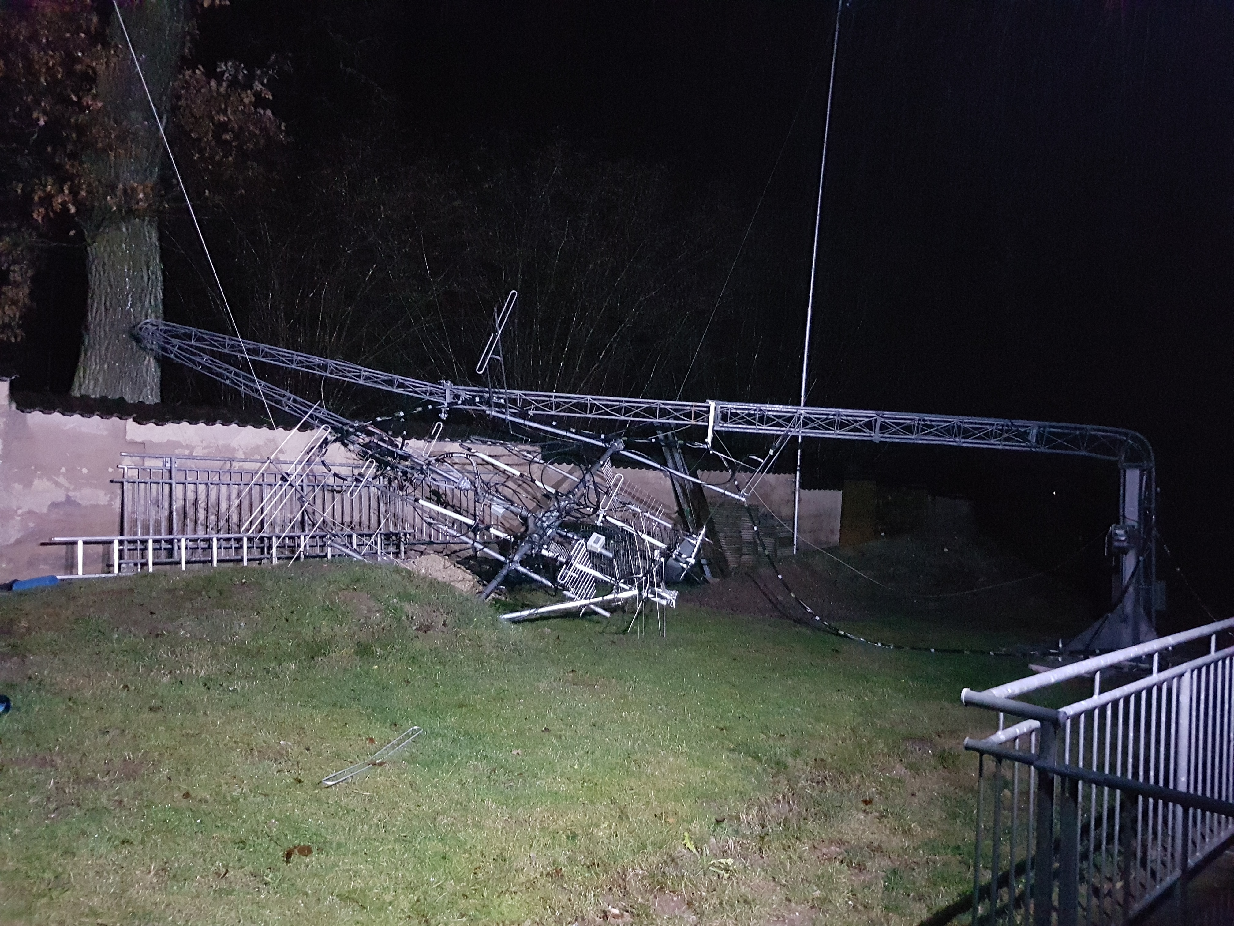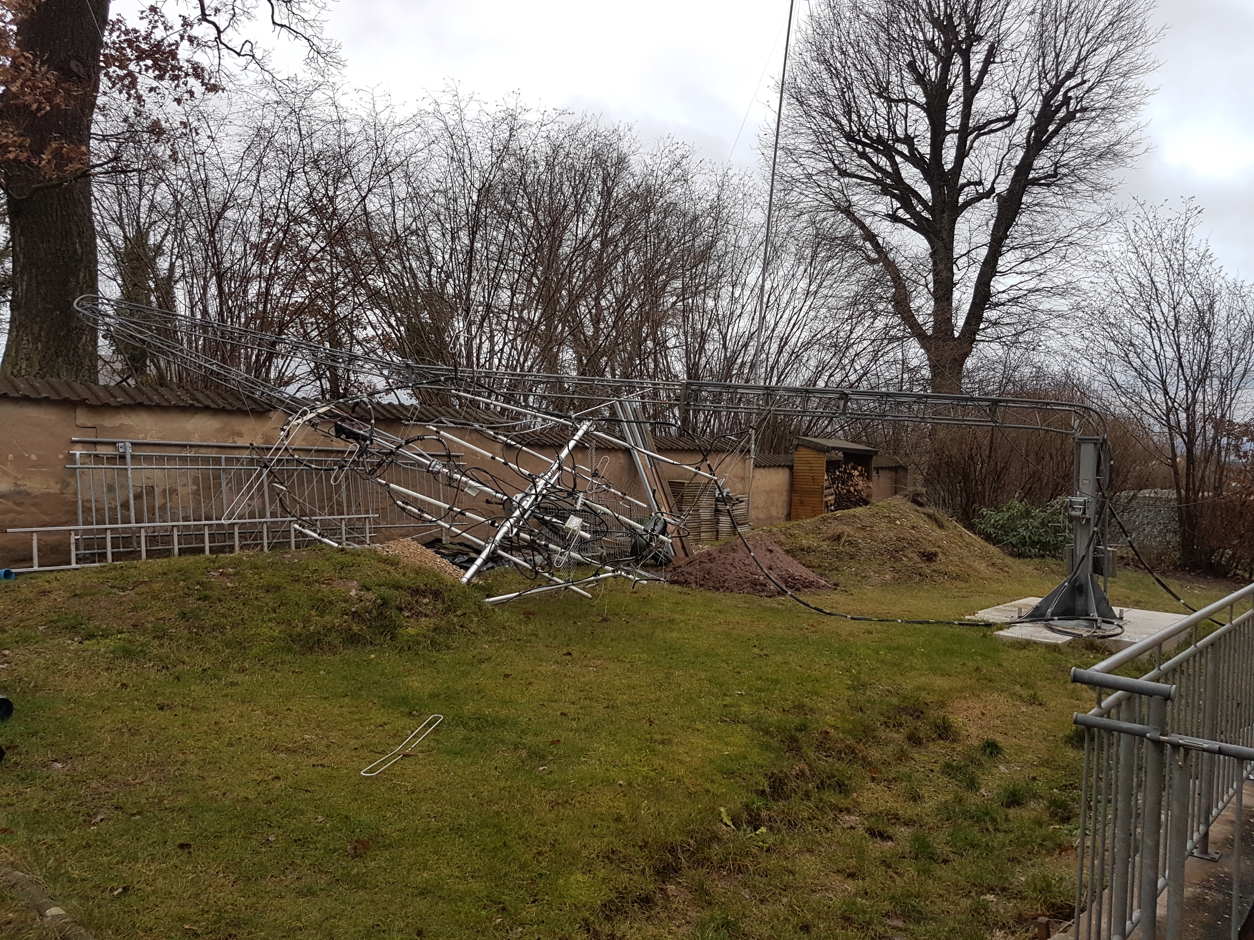 24th December 2018 at 02:45 local time in the night my yl and I waked up by the noise of a big storm around our house. Wheatherforecast had been only for a rain-front and strong wind but no storm warning. My tower was at my standard height of 14m (of 17m). I got out of the house to lower the tower, but coming around the house my loved tower was already down, totally destroyed as well as my 3x4 VHF/UHF antennas.